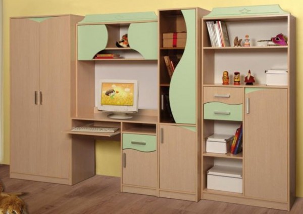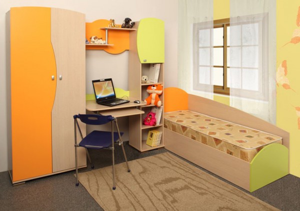 Модные яркие цвета. Функциональные элементы-кровать с выкатными ящиками, стол с выдвижной полкой под клавиатуру, вместительные шкафы.