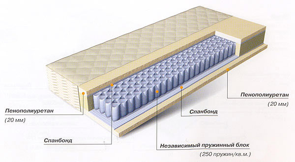 Матрас средней жесткости на основе блока независимых пружин EVS 500, который равномерно распределяет нагрузку по всей горизонтальной поверхности матраса и обеспечивает направленную поддержку позвоночника.