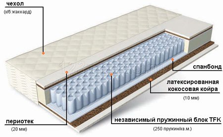 Матрас средней жесткости на основе блока независимых пружин EVS 500, который равномерно распределяет нагрузку по всей горизонтальной поверхности матраса и обеспечивает направленную поддержку позвоночника. В качестве наполнения используются холкон и латексированная кокосовая койра. Выраженные ортопедические и анатомические свойства.