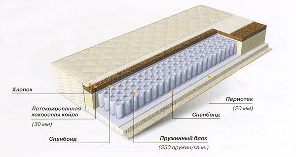 Матрас с разной жесткостью сторон на основе блока независимых пружин EVS 500, который равномерно распределяет нагрузку по всей горизонтальной поверхности матраса и обеспечивает направленную поддержку позвоночника. В качестве наполнителей с одной стороны используется периотек, а с другой — латексированная кокосовая койра. Жесткая сторона может применяться во время болевого обострения в области спины.