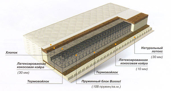 Матрас с разной жесткостью сторон на основе пружинного блока Bonnell обеспечивает надежную поддержку позвоночника во время сна и отдыха. В качестве наполнения с одной стороны используется латексированная кокосовая койра, а с другой - койра и натуральный латекс. В модели применяются только натуральные материалы.