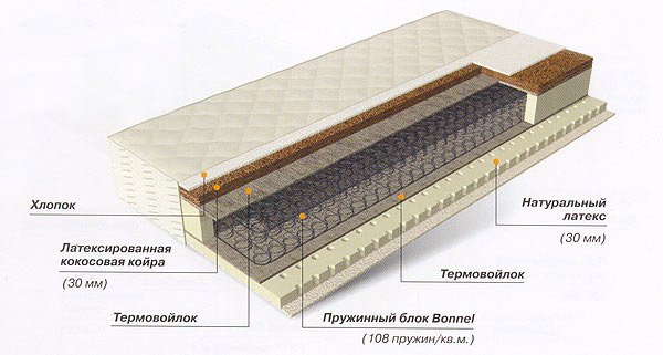 Матрас с разной жесткостью сторон на основе пружинного блока Bonnell обеспечивает надежную поддержку позвоночника во время сна и отдыха. В качестве наполнителей с одной стороны используется латексированная кокосовая койра, а с другой - натуральный латекс. Удобная бюджетная модель на основе натуральных материалов-наполнителей.